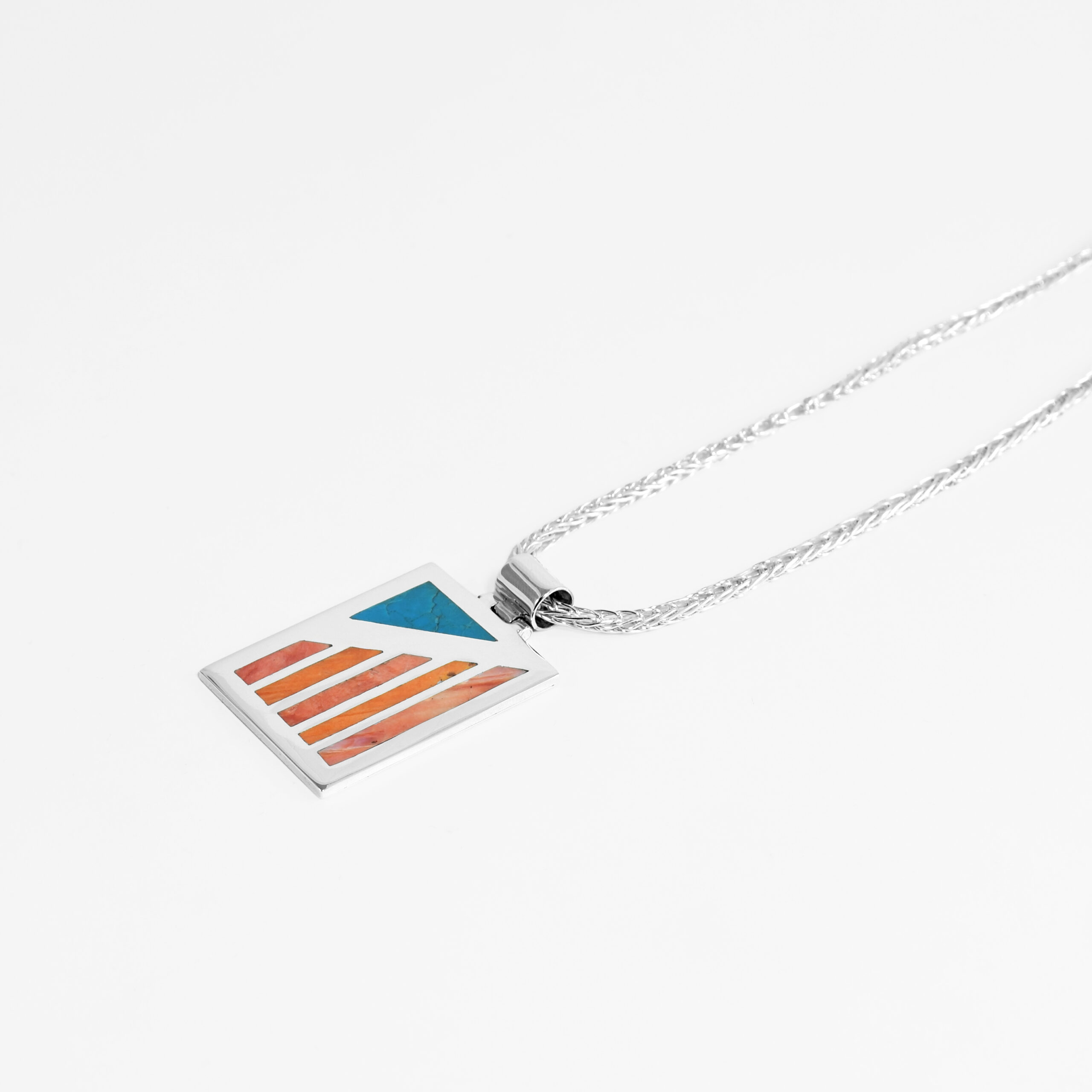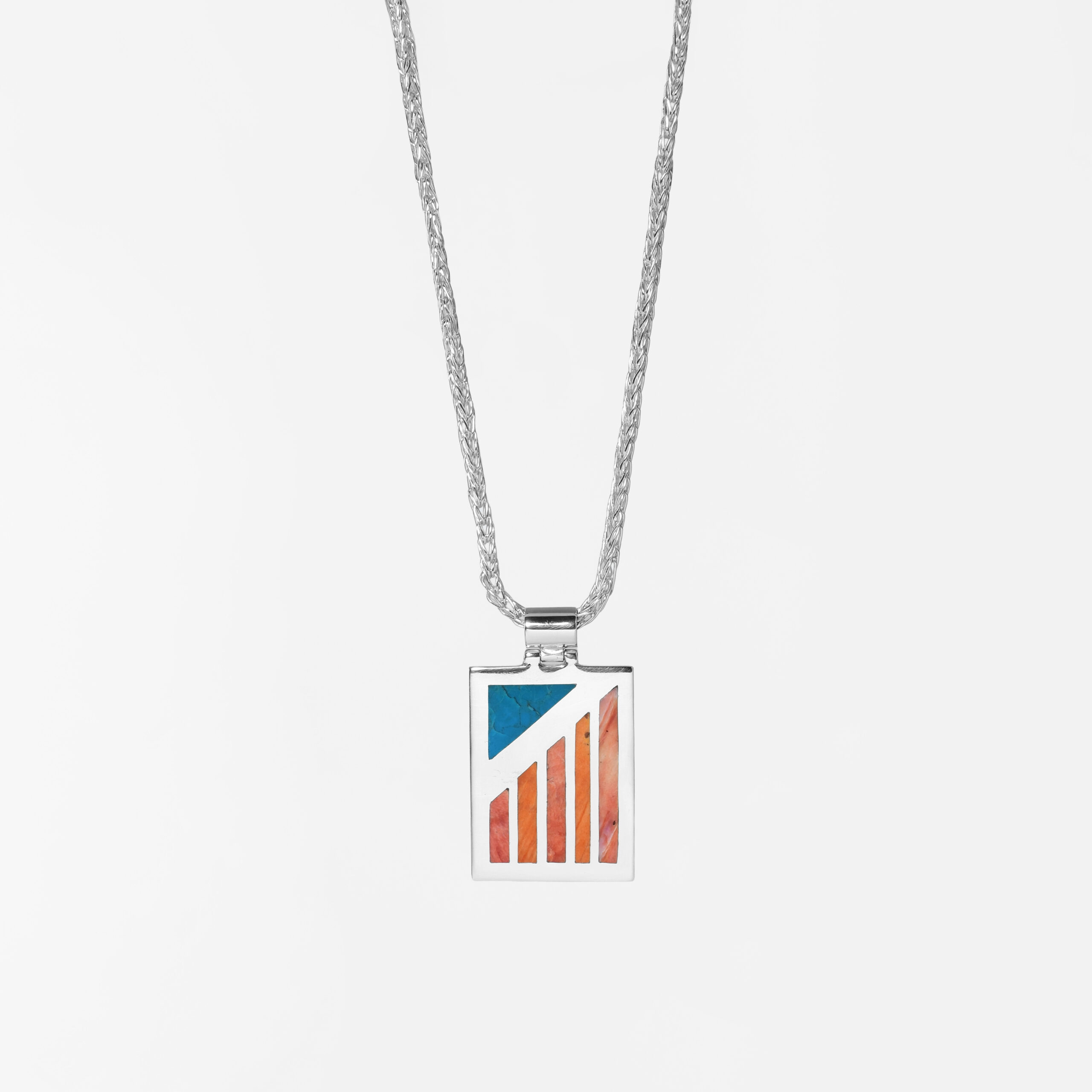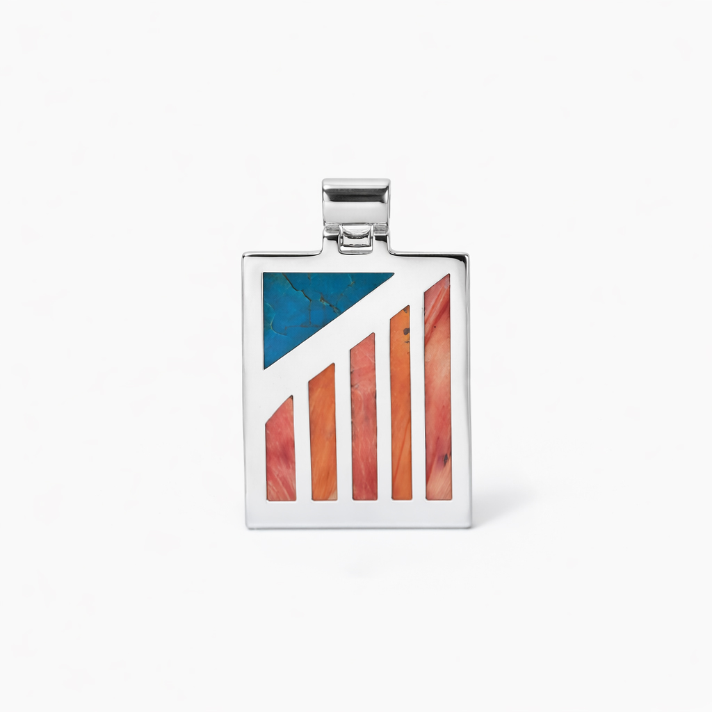 Structural Sterling Silver pendant featuring a complex inlay of Chrysocolla and Spondylus shell. A narrative piece that honors ancestral materials, mosaic precision, and vibrant chromatic balance.