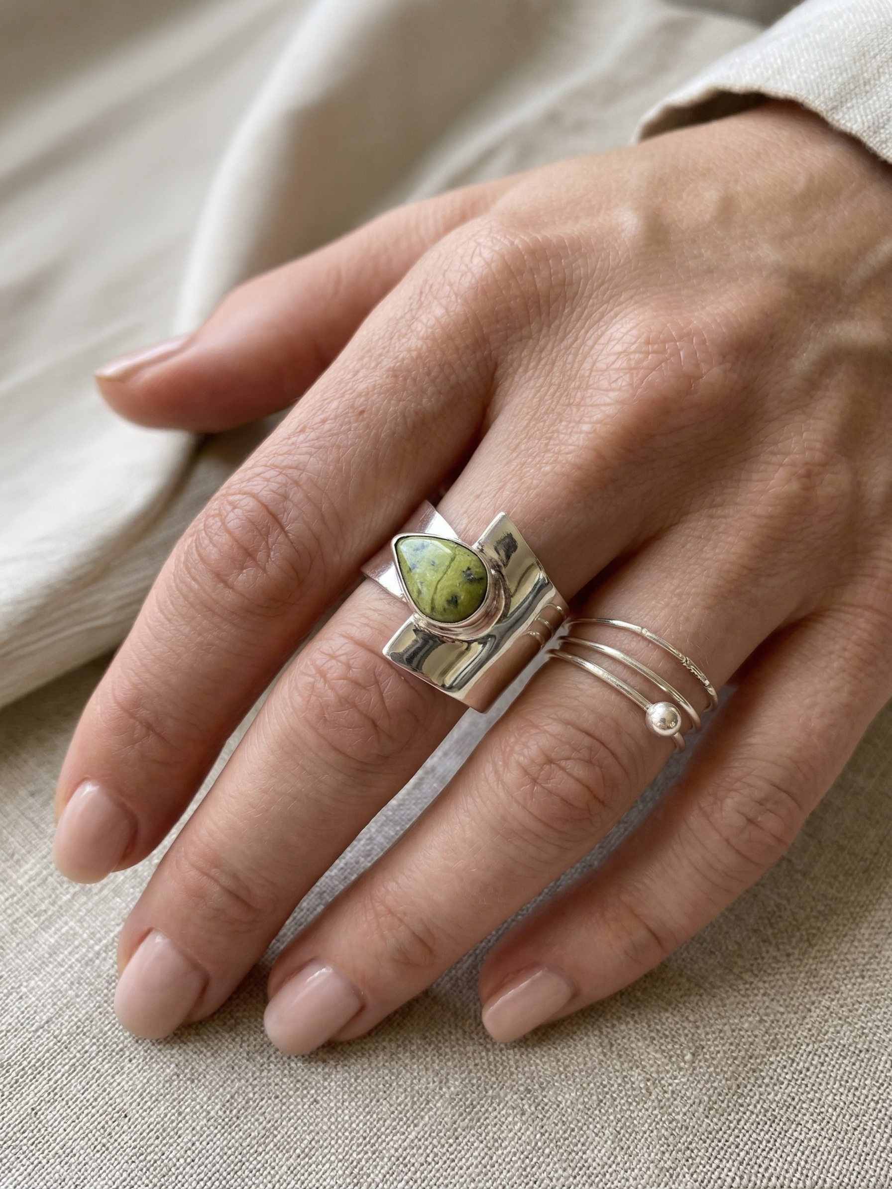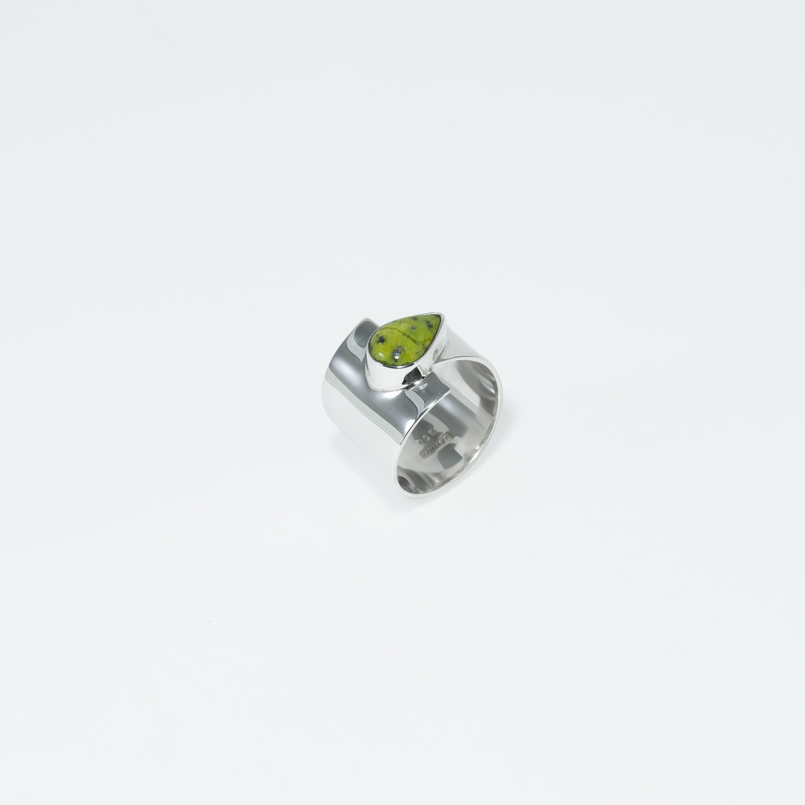 950 Sterling Silver ring featuring an axe-shaped and a natural serpentine teardrop. A narrative piece that honors historical silhouettes, metallic volume, and professional jewelry precision.