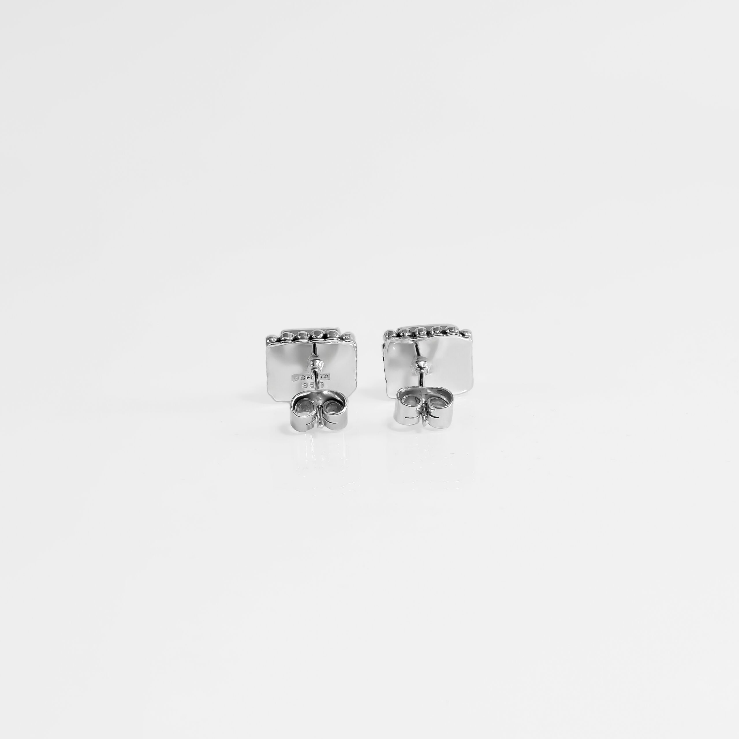 Medium 950 Sterling Silver square stud earrings featuring a surrounding row of decorative silver beads and a central natural stone. A technical piece that honors textural relief and professional jewelry excellence.