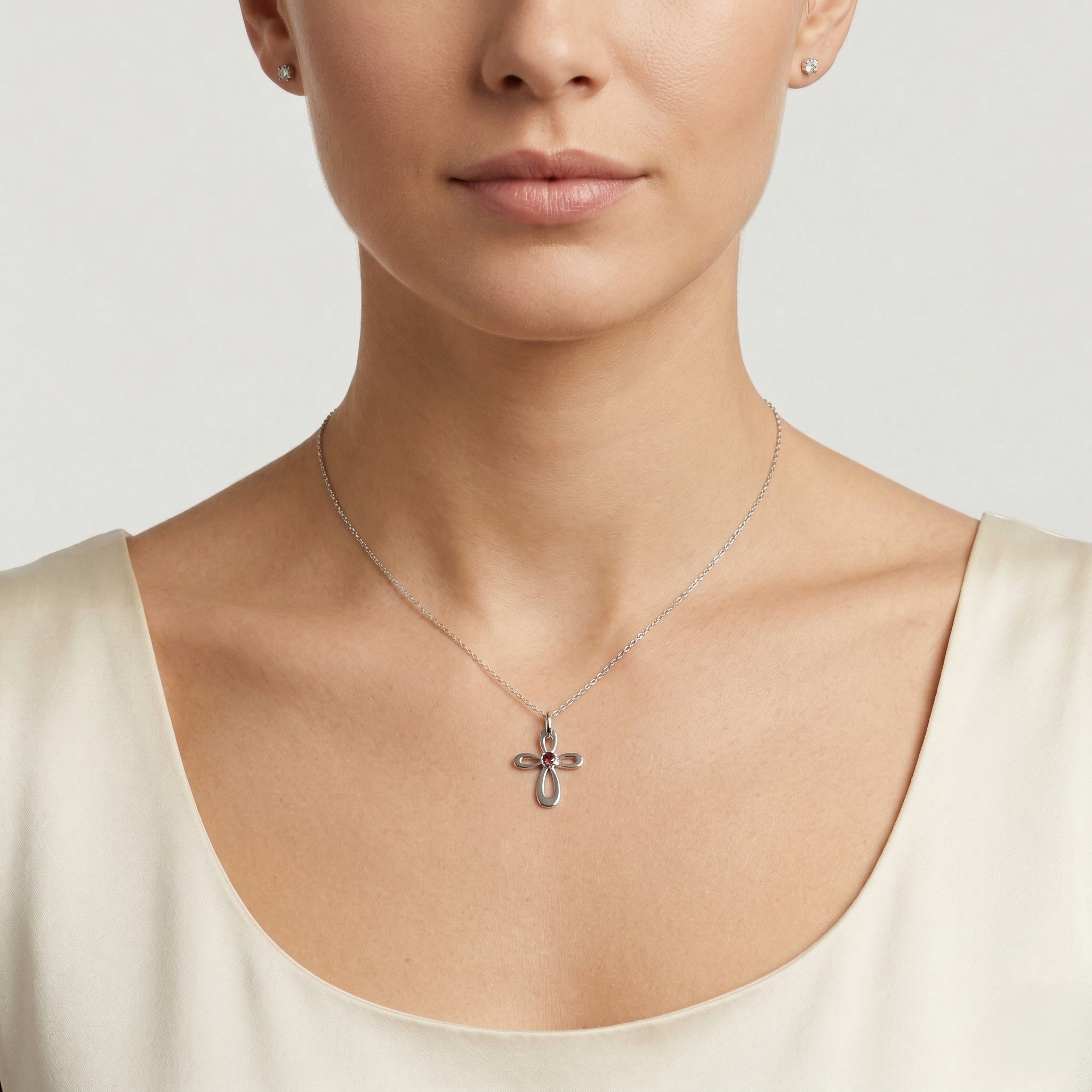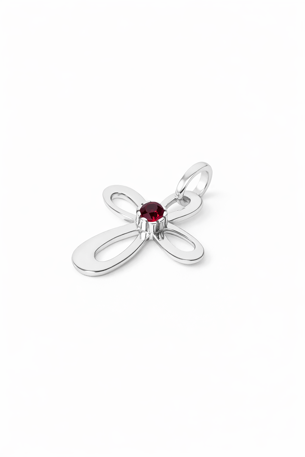 Sophisticated solid 18K white gold Celtic cross pendant featuring a 0.3 ct round natural ruby in a secure bezel setting. A spiritual piece that honors ancestral symbolism, fluid metalwork, and the passionate intensity of precious stones.