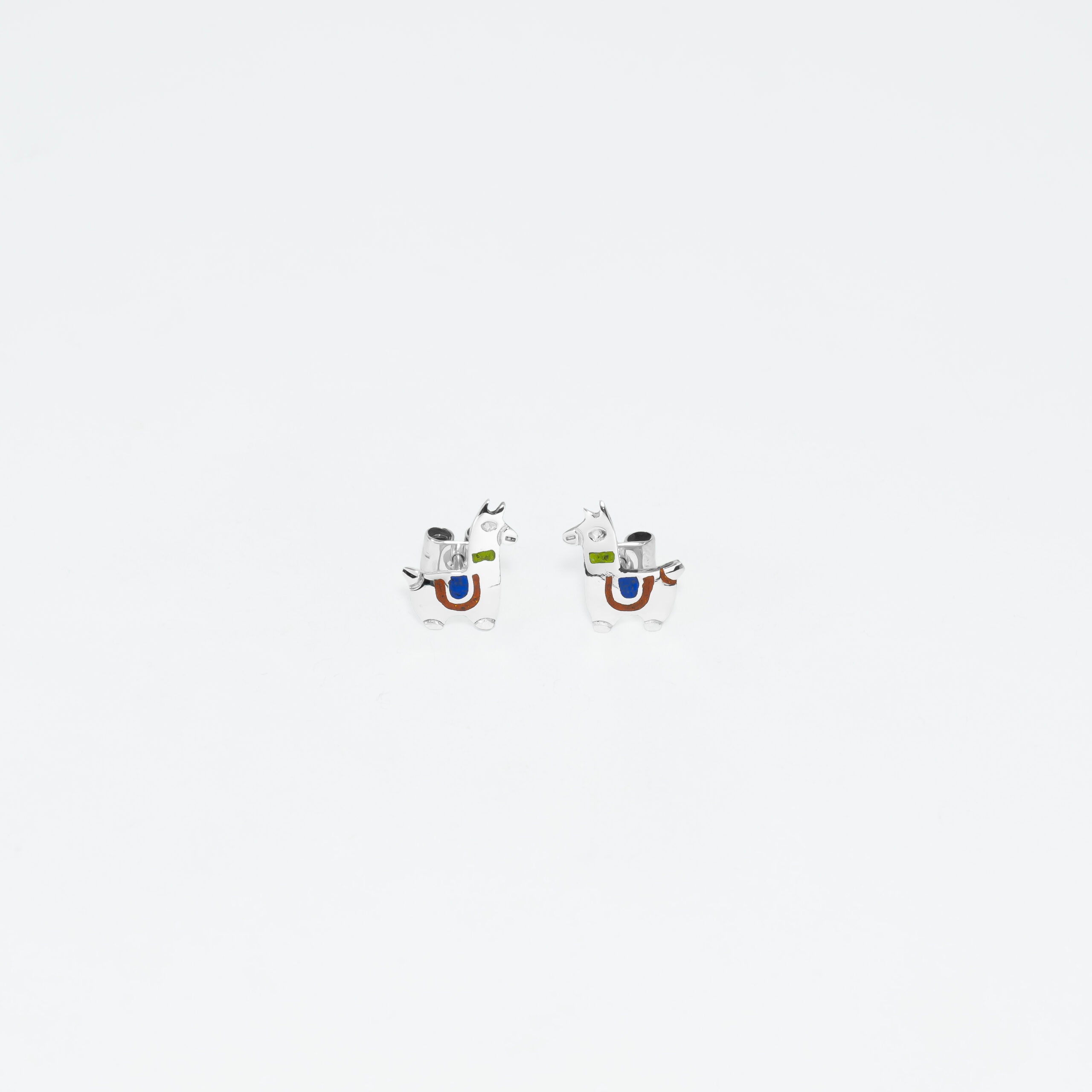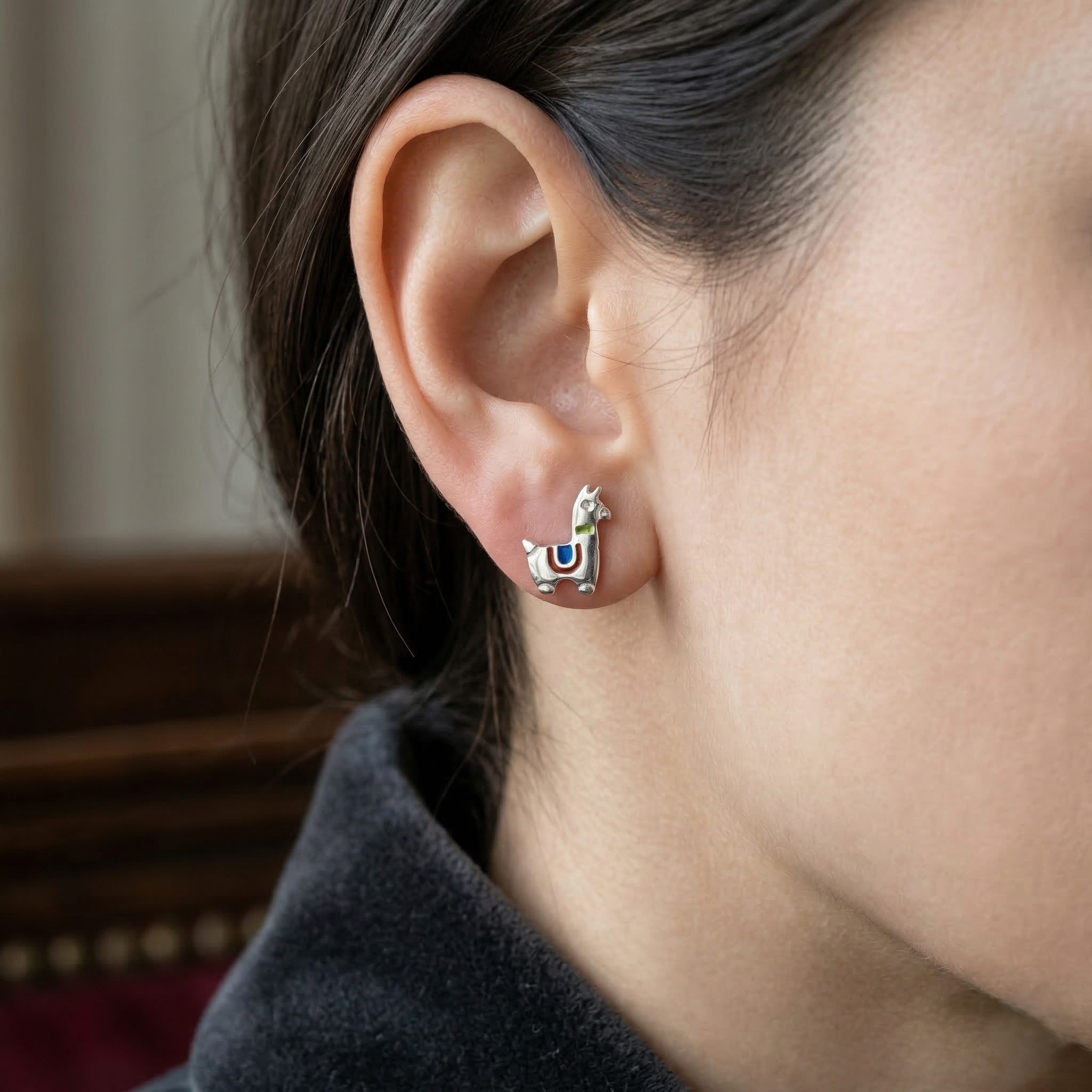 Medium 950 Sterling Silver earrings featuring a llama design with multi-color crushed stone inlays. A technical masterpiece that honors zoomorphic detail and professional stone mosaic work.