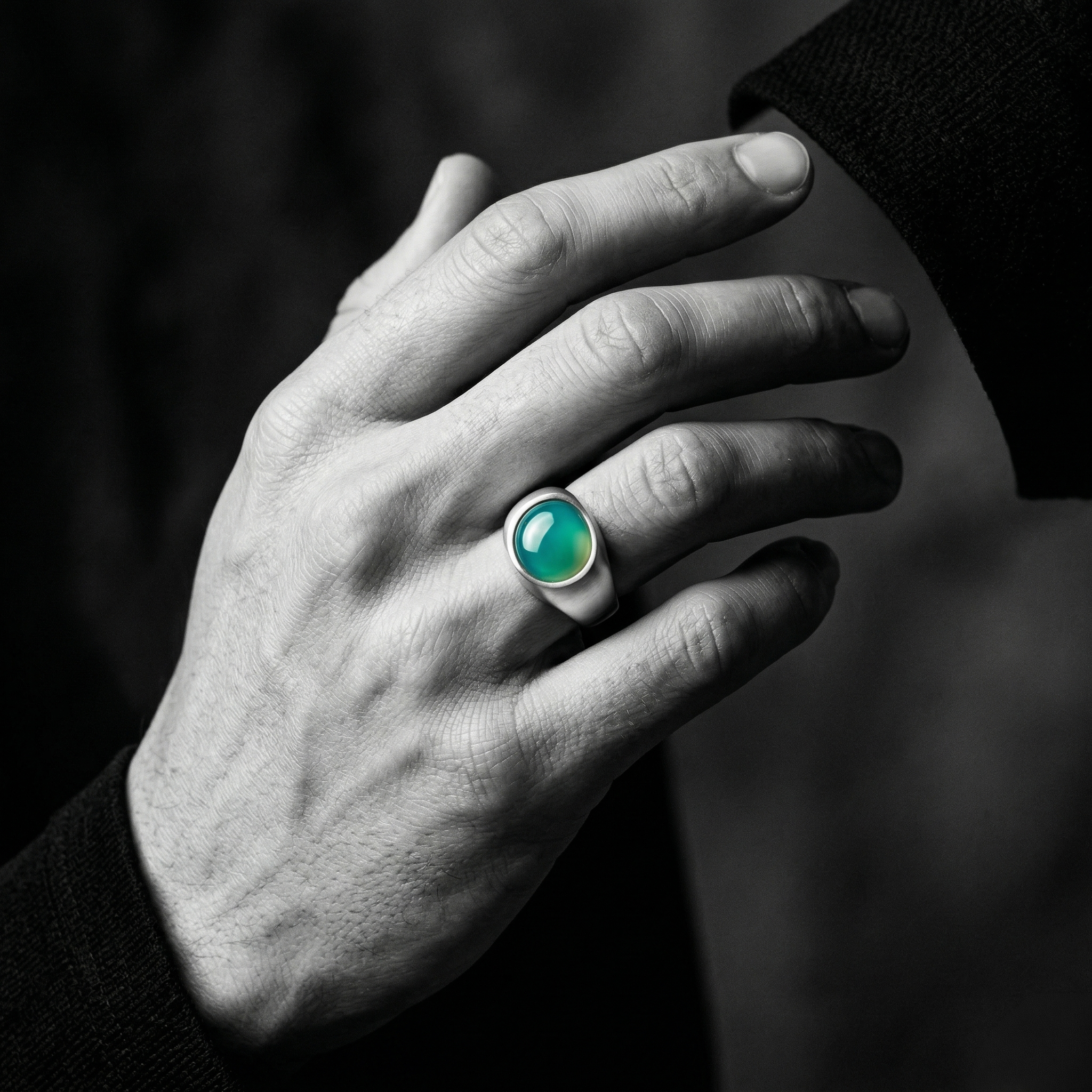 950 Sterling Silver masculine ring featuring an oval Andean Opal in a concave bezel setting. A technical masterpiece that honors stone setting (engaste), structural depth, and professional jewelry excellence (Size 11).
