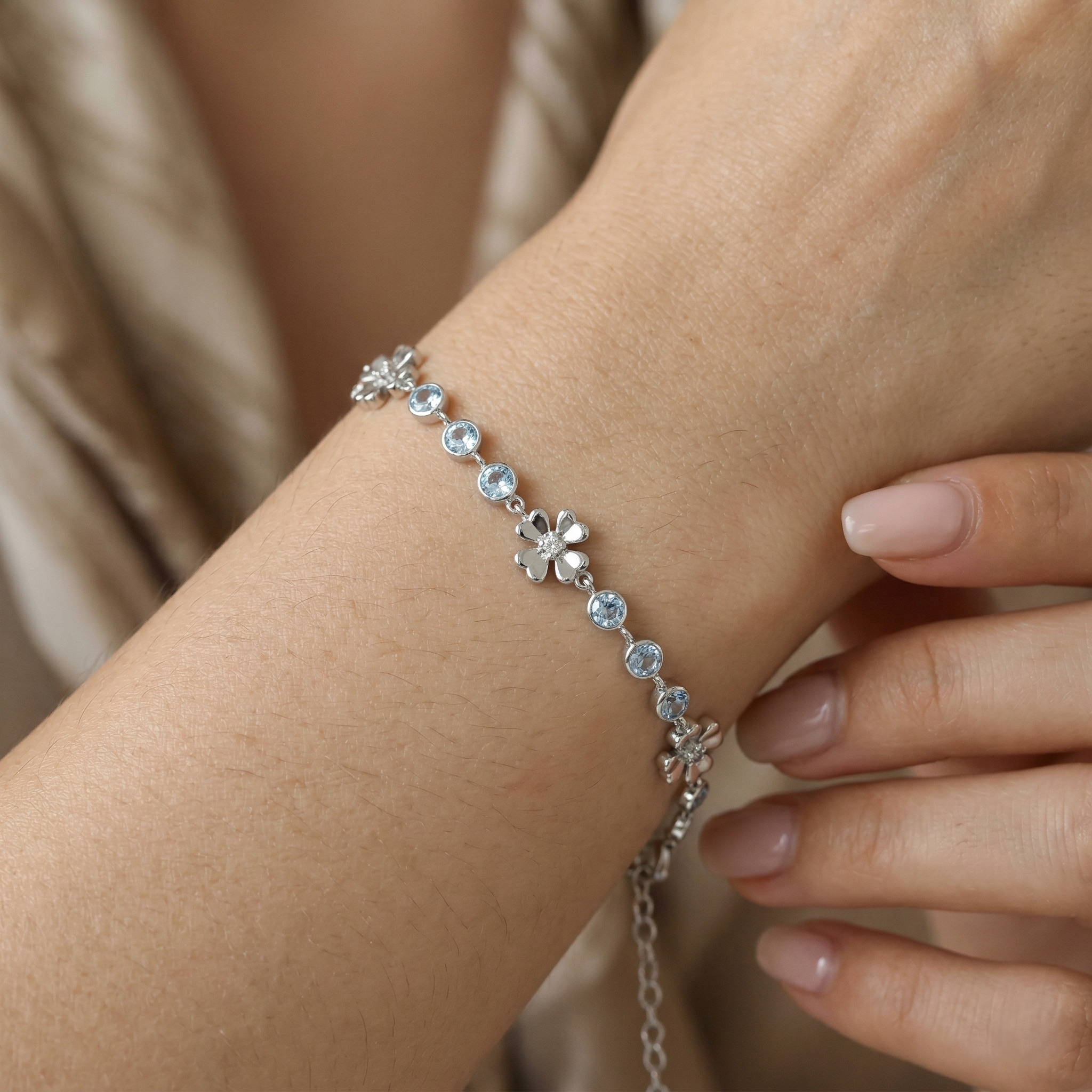 Avoid contact with chemicals and perfumes. Use a specialized silver polishing cloth to maintain the brilliance of the stones. Store in its original case when not in use.