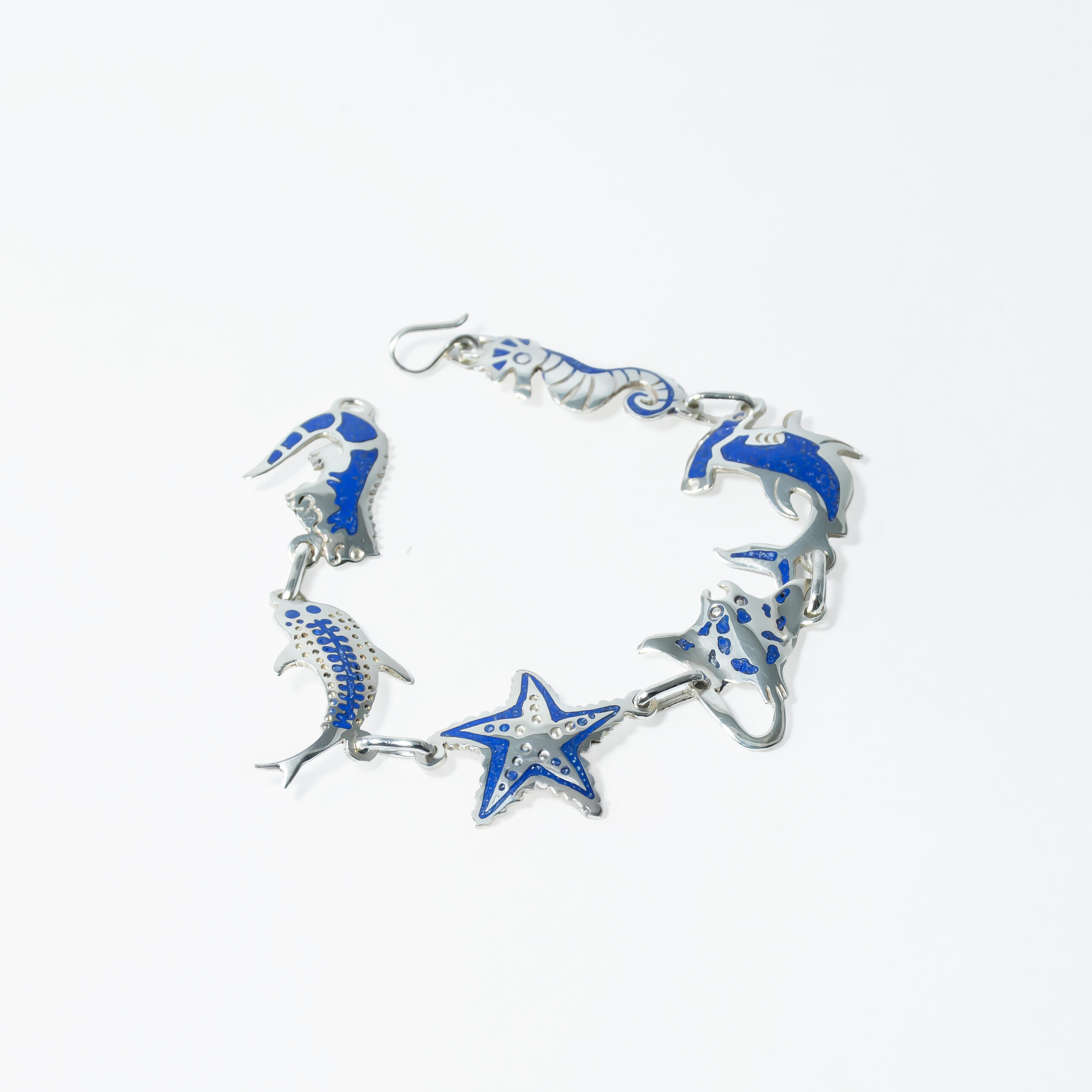 950 Sterling Silver 18cm bracelet featuring Galapagos animal motifs and blue crushed stone inlays. A technical masterpiece that honors mosaic inlay work, structural balance, and professional jewelry excellence.