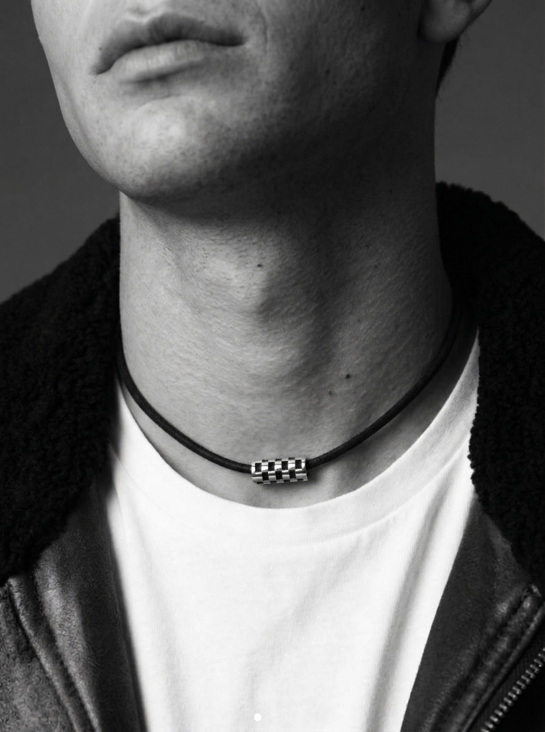 950 Sterling Silver cylinder pendant featuring rectangular high-gloss sections and black stone inlays. A technical masterpiece that honors high-contrast inlay, geometric rhythm, and professional jewelry excellence. Includes a 20-inch chain.