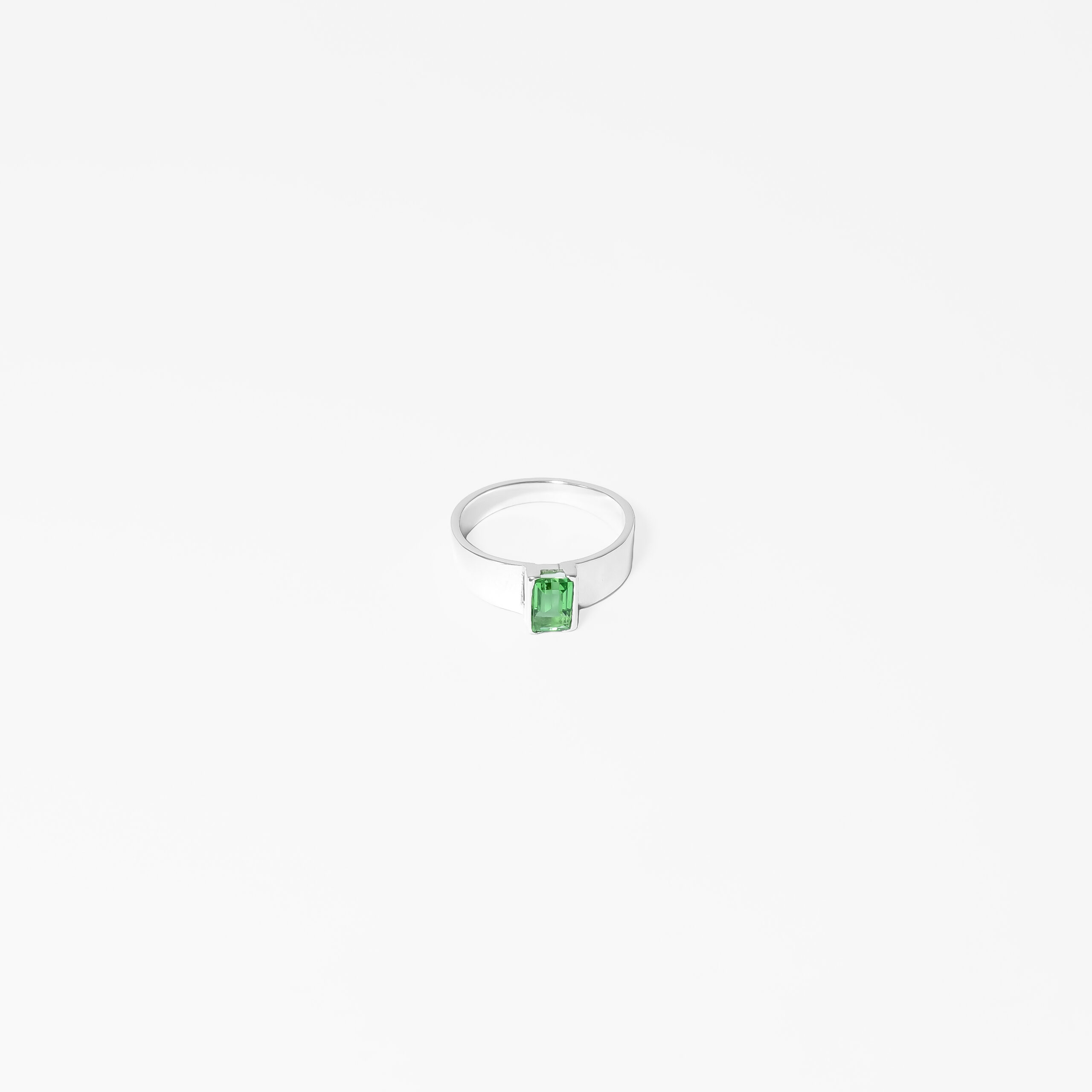 950 Sterling Silver ring featuring a 0.87 CT rectangular natural green obsidian and side- settings with a lower light port. A technical piece that honors mineral transparency, structural framing, and professional jewelry precision.