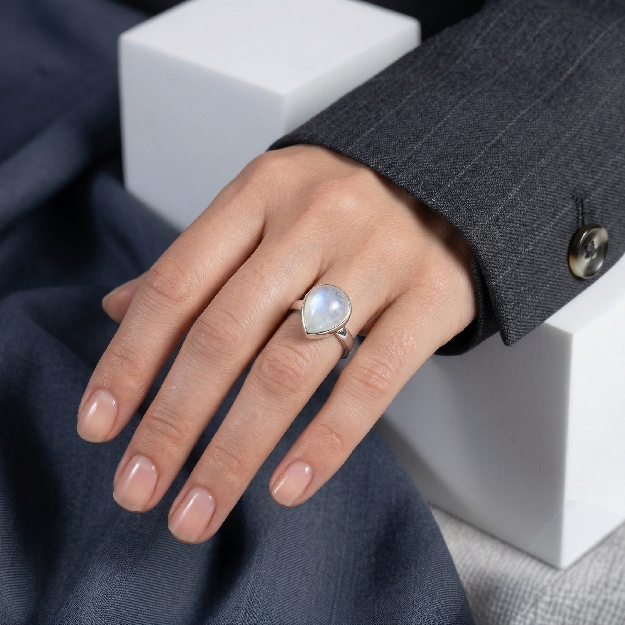 950 Sterling Silver ring featuring a medium teardrop natural moonstone with a thick bezel setting and sheet-metal band. A technical piece that honors structural volume, light refraction, and professional jewelry excellence.