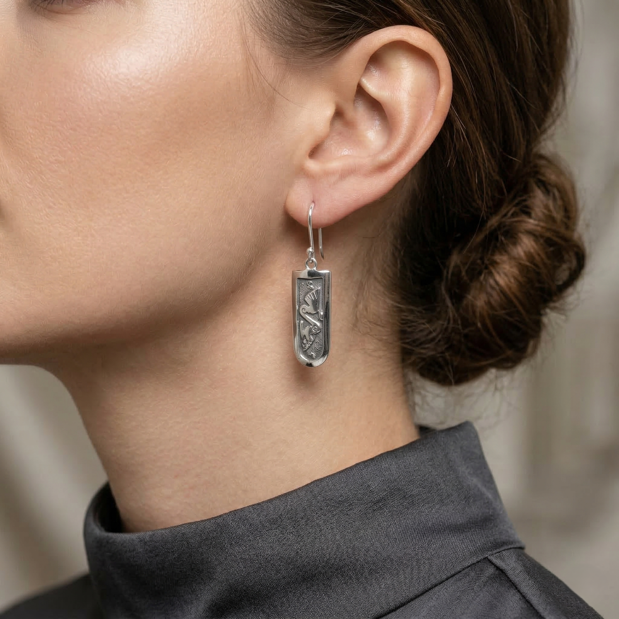 Large 950 Sterling Silver earrings featuring a stylized frame and two-pelican design. A technical masterpiece that honors structural framing, avian iconography, and professional jewelry excellence.
