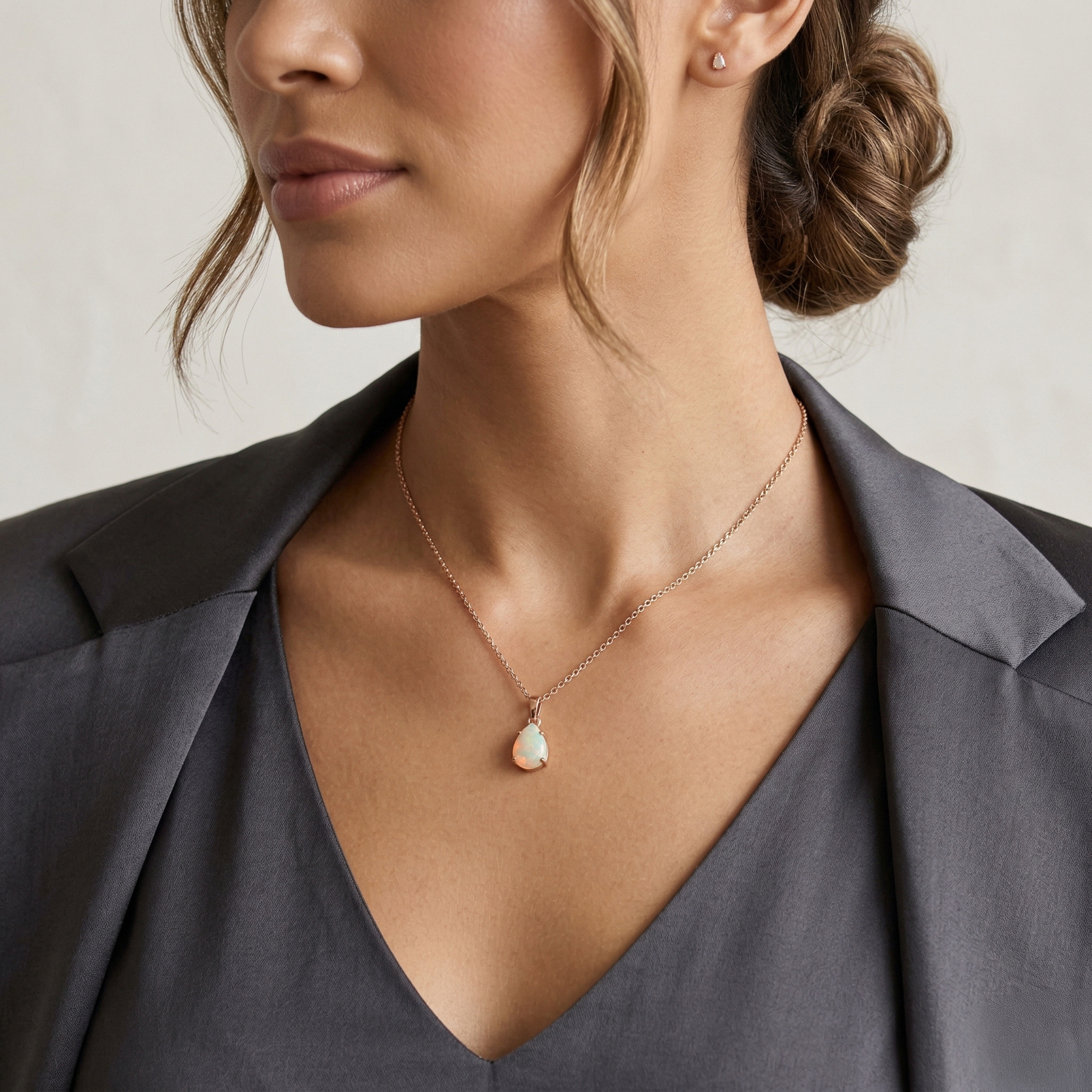 Ethereal solid 18K rose gold pendant featuring a natural pear-cut Australian opal in a specialized curved-prong mounting. A delicate piece that honors organic iridescence, warm metal tones, and artisanal excellence.