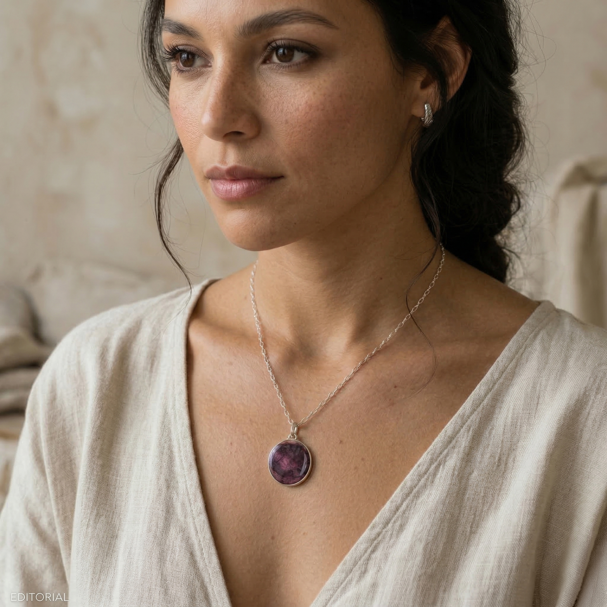 Each pendant is individually handcrafted by our master jewelers. The natural growth rings and deep violet saturation of the shell are markers of its exceptional quality and artisanal origin.