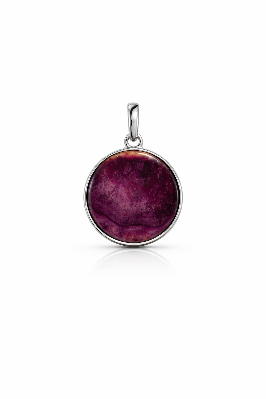 Sophisticated Sterling Silver pendant featuring a medium-sized round natural purple shell. A contemporary piece that honors organic textures, robust silver-smithing, and chromatic depth.