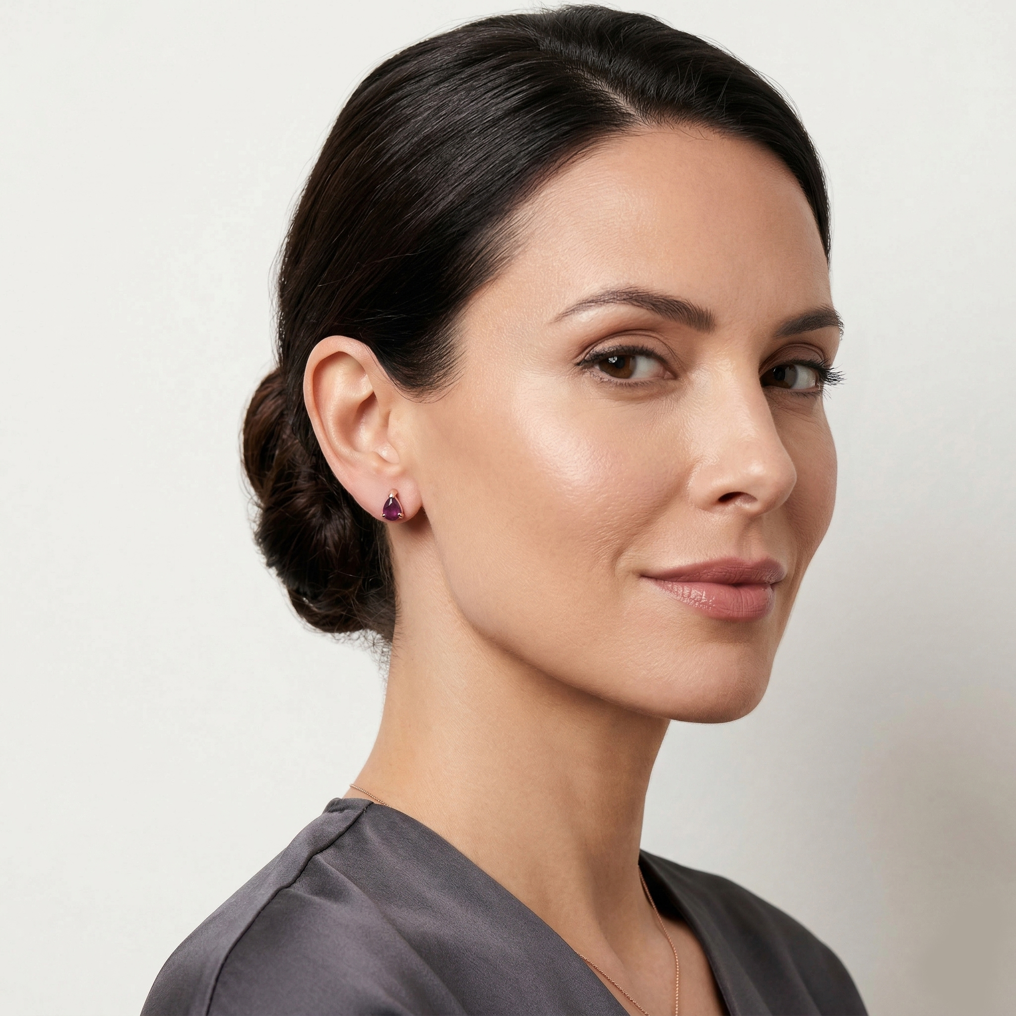 Contemporary solid 18K rose gold stud earrings featuring a total of 0.95 ct pear-cut purple sapphires in a specialized flat-prong wrap setting. A delicate piece that honors clean lines, vibrant chromatic depth, and artisanal precision.